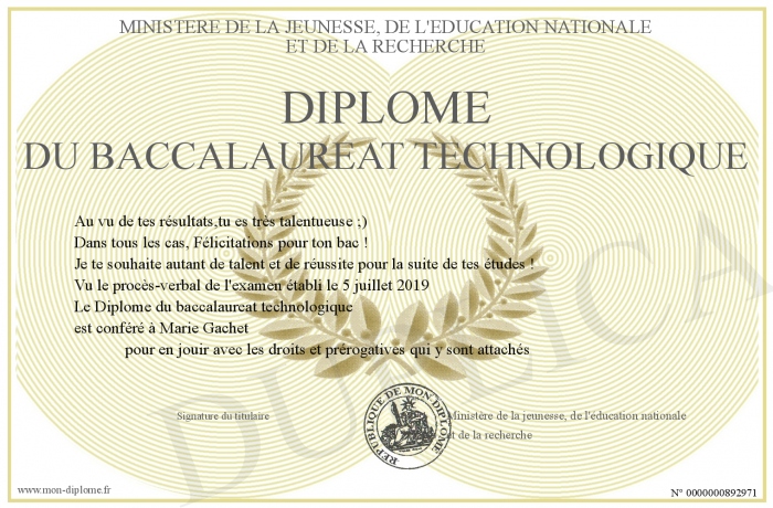 Envoyez par email votre Diplôme du baccalaureat technologique personalisé