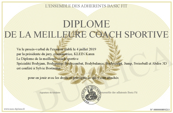Envoyez par email votre Diplôme de la meilleure coach sportive personalisé