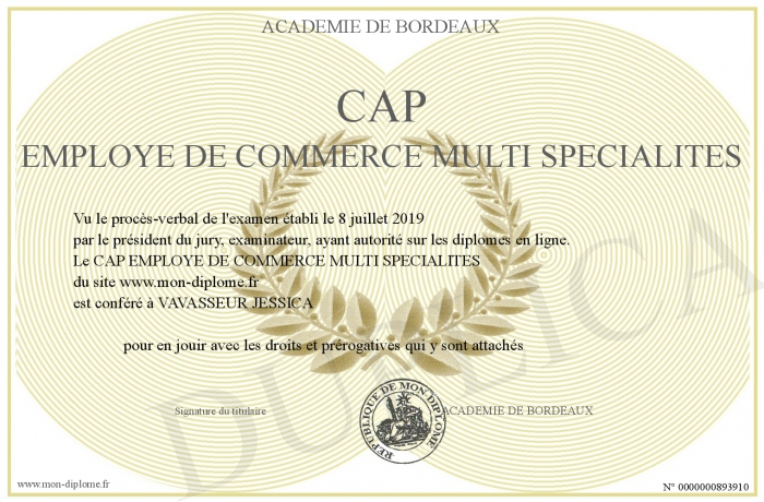 Envoyez par email votre CAP EMPLOYE DE COMMERCE MULTI SPECIALITES personalisé