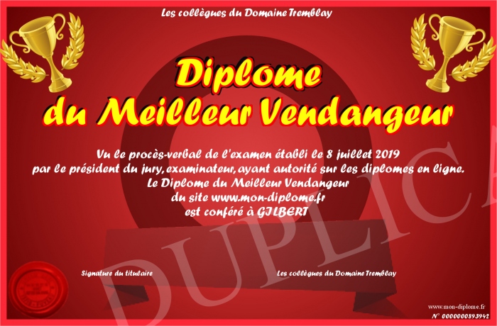 Envoyez par email votre Diplôme du Meilleur Vendangeur personalisé