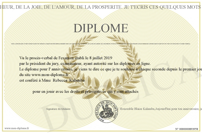 Envoyez par email votre diplome pour l' anniversaire, je viens te dire ce que je te souhaite à chaque seconde depuis le premier jour où je t'ai rencontré : du bonheur, de la joie, de l'amour, de la prospérité. Je t'écris ces quelques mots pour te souhaiter le plus tendre des anniversaires et que tous tes voeux s'exaucent. Je t'aime.t général personalisé