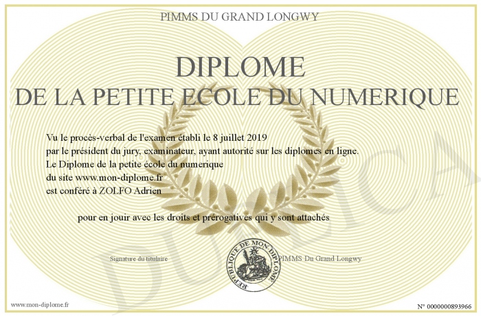 Envoyez par email votre Diplôme de la petite école du numerique personalisé