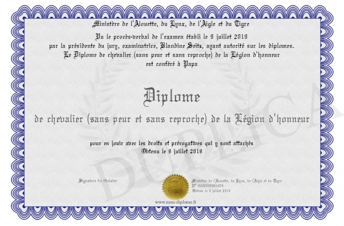 Envoyez par email votre Diplôme de chevalier (sans peur et sans reproche) de la Légion d'honneur personalisé