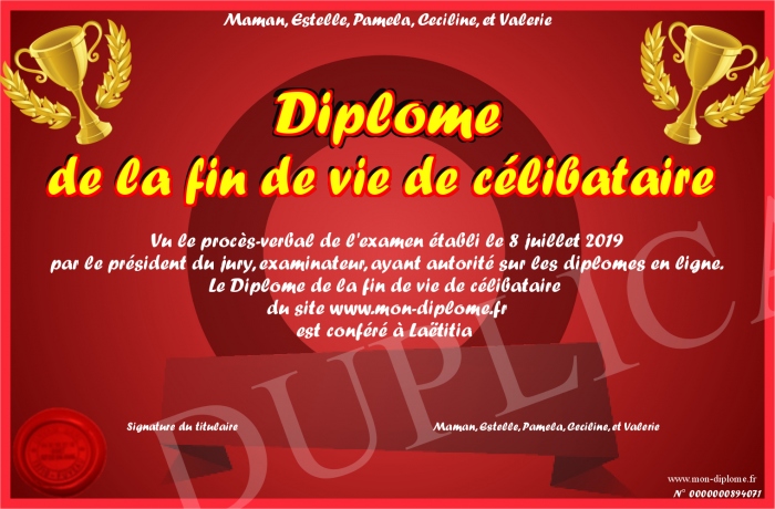 Envoyez par email votre Diplôme de la fin de vie de célibataire personalisé
