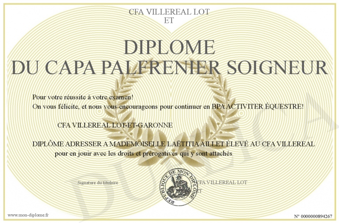 Envoyez par email votre Diplôme du CAPa Palfrenier Soigneur personalisé
