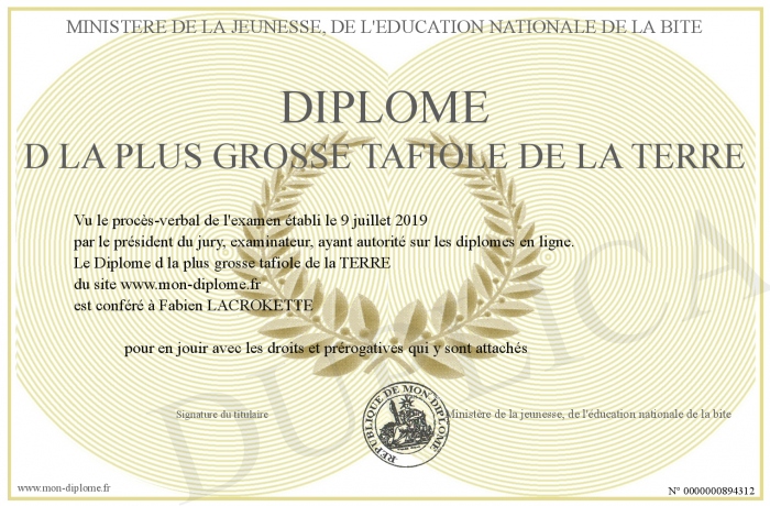 Envoyez par email votre Diplôme d la plus grosse tafiole de la TERRE personalisé