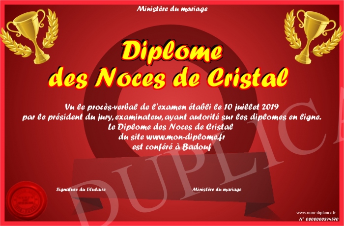 Envoyez par email votre Diplôme des Noces de Cristal personalisé