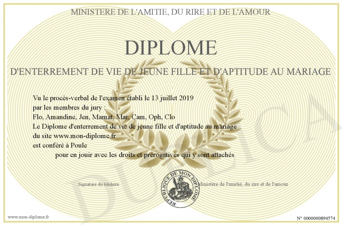 Envoyez par email votre Diplôme d'enterrement de vie de jeune fille et d'aptitude au mariage personalisé