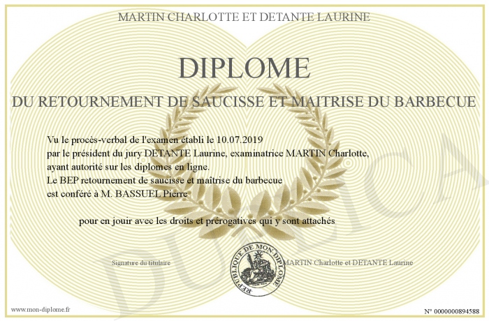 Envoyez par email votre Diplôme du retournement de saucisse et maitrise du barbecue personalisé