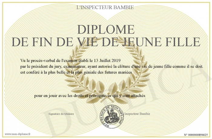 Envoyez par email votre Diplôme de fin de vie de jeune fille personalisé
