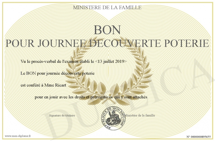 Envoyez par email votre BON pour journée découverte poterie personalisé