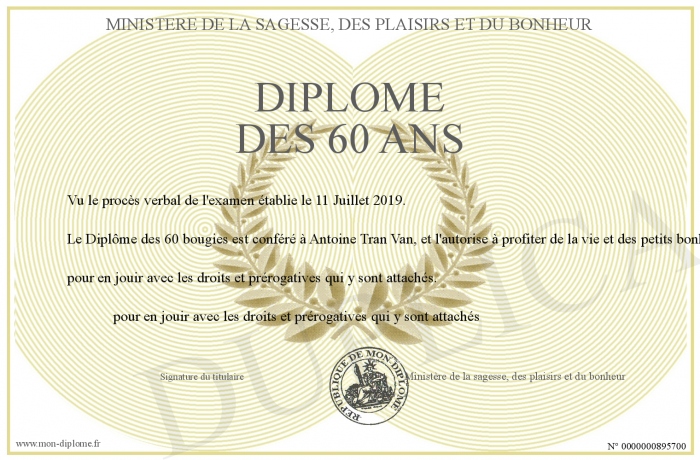 Envoyez par email votre Diplôme des 60 ans personalisé