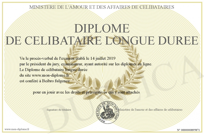 Envoyez par email votre Diplôme de célibataire longue durée personalisé