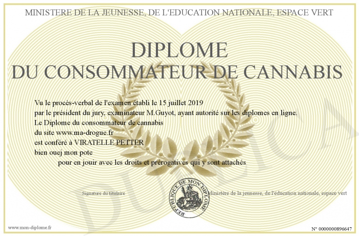 Envoyez par email votre Diplôme du consommateur de cannabis personalisé
