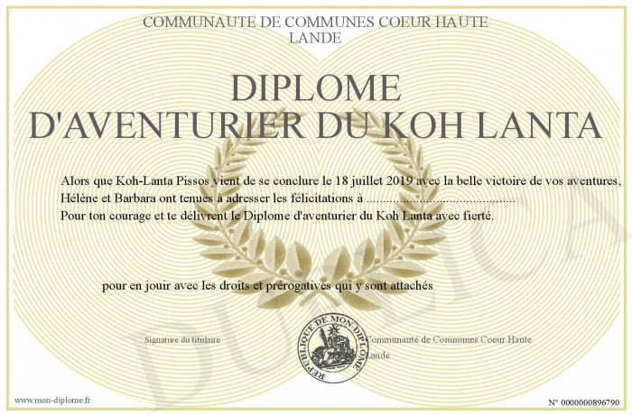 Envoyez par email votre Diplôme d'aventurier du Koh Lanta personalisé