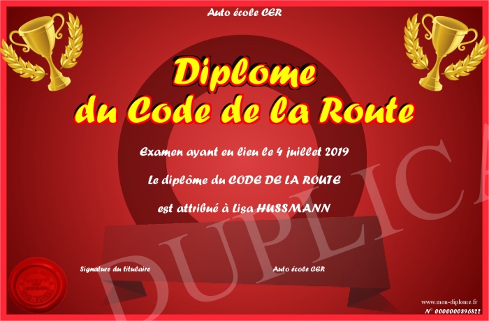 Envoyez par email votre Diplôme du Code de la Route personalisé