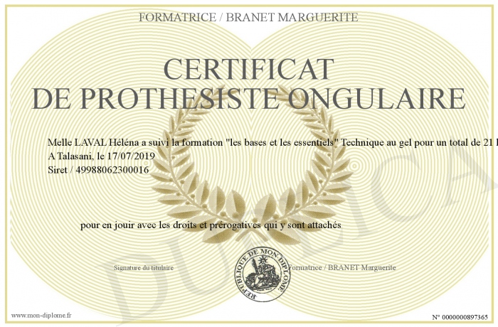 Envoyez par email votre Certificat de prothésiste ongulaire personalisé