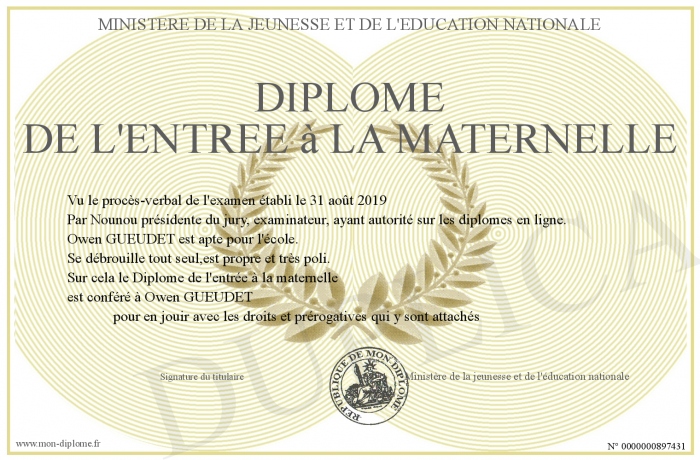 Envoyez par email votre Diplôme de l'entrée à la maternelle personalisé
