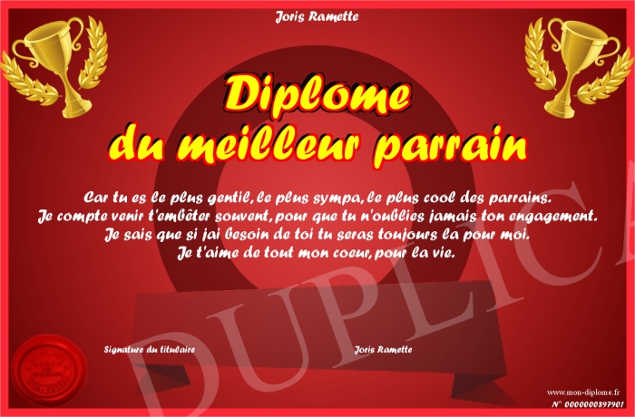 Envoyez par email votre Diplôme du meilleur parrain personalisé