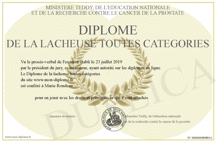 Envoyez par email votre Diplôme de la lacheuse toutes catégories personalisé