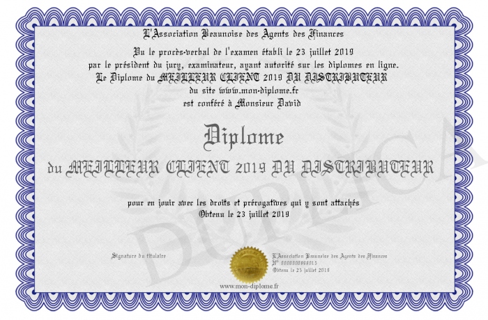 Envoyez par email votre Diplôme du MEILLEUR CLIENT 2019 DU DISTRIBUTEUR personalisé