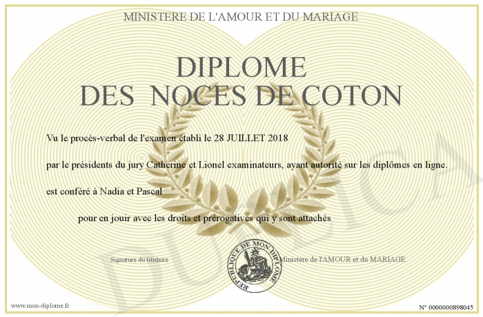 Envoyez par email votre diplôme des NOCES DE COTON personalisé