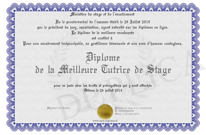 Envoyez par email votre Diplôme de la Meilleure Tutrice de Stage personalisé