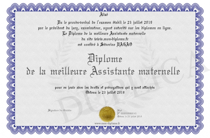 Envoyez par email votre Diplôme de la meilleure Assistante maternelle personalisé