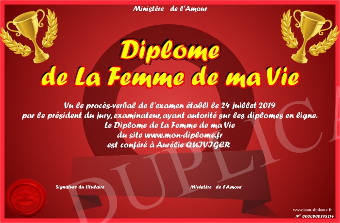 Envoyez par email votre Diplôme de La Femme de ma Vie personalisé