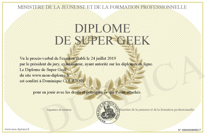 Envoyez par email votre Diplôme de Super Geek personalisé