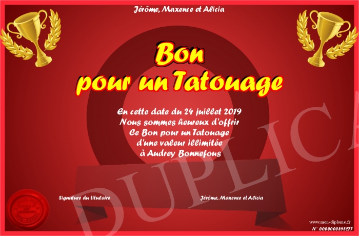 Envoyez par email votre Bon pour un Tatouage personalisé