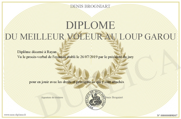 Envoyez par email votre Diplôme du meilleur voleur au Loup Garou personalisé