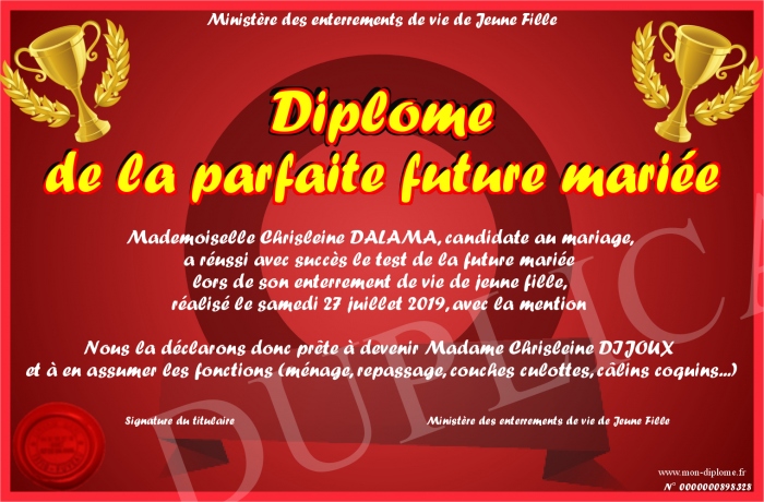 Envoyez par email votre Diplôme de la parfaite future mariée personalisé