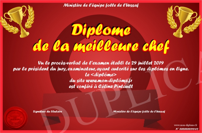 Envoyez par email votre Diplôme de la meilleure chef personalisé