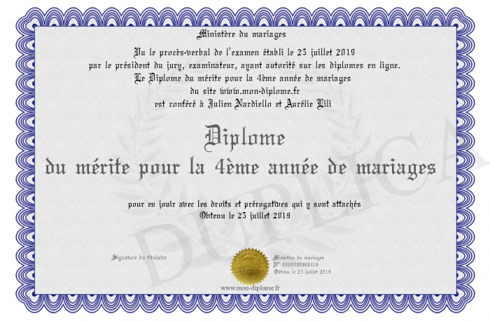 Envoyez par email votre Diplôme du mérite pour la 4ème année de mariages personalisé