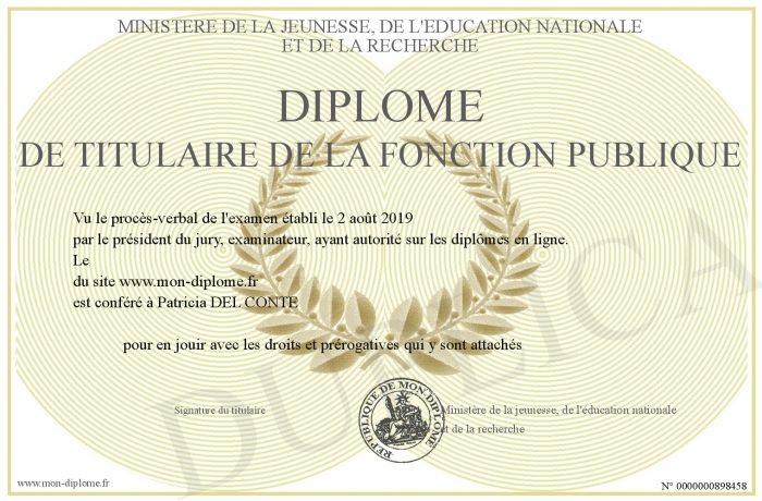 Envoyez par email votre Diplôme de titulaire de la Fonction Publique personalisé