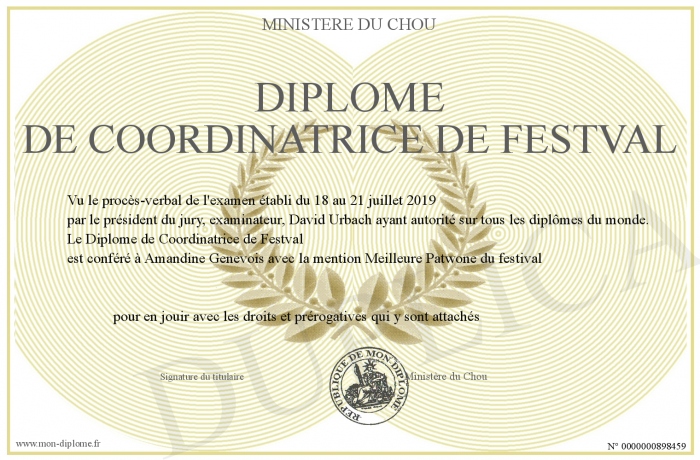 Envoyez par email votre Diplôme de Coordinatrice de Festval personalisé