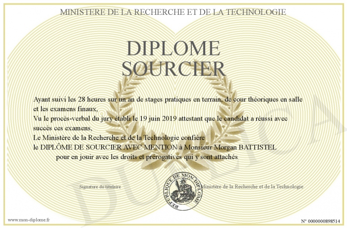 Envoyez par email votre Diplôme Sourcier personalisé