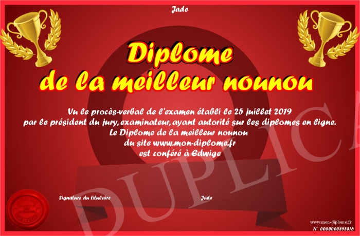 Envoyez par email votre Diplôme de la meilleur nounou personalisé