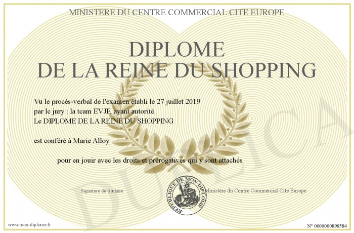 Envoyez par email votre DIPLOME DE LA REINE DU SHOPPING personalisé