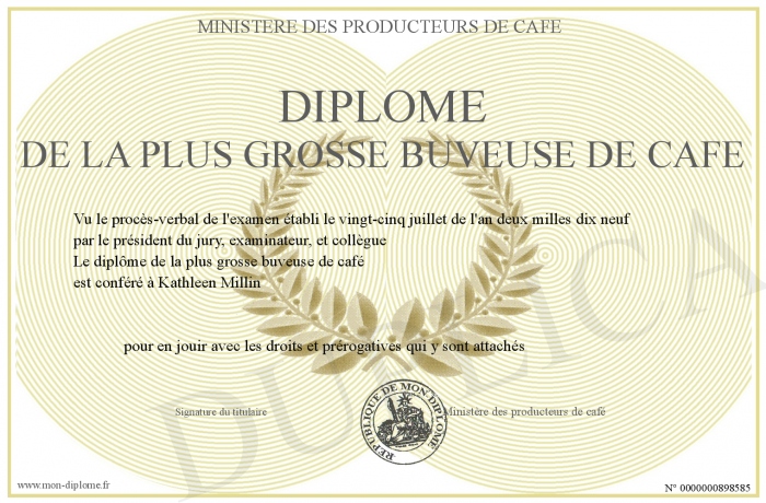 Envoyez par email votre Diplôme de la plus grosse buveuse de café personalisé