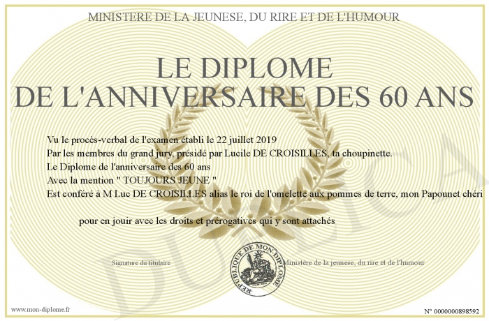 Envoyez par email votre Le Diplôme de l'anniversaire des 60 ans personalisé