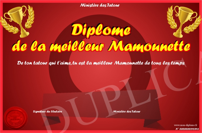 Envoyez par email votre Diplôme de la meilleur Mamounette personalisé