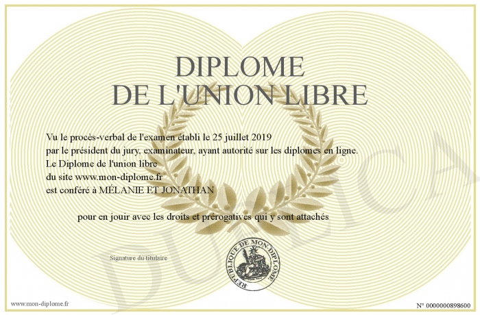 Envoyez par email votre Diplôme de l'union libre personalisé