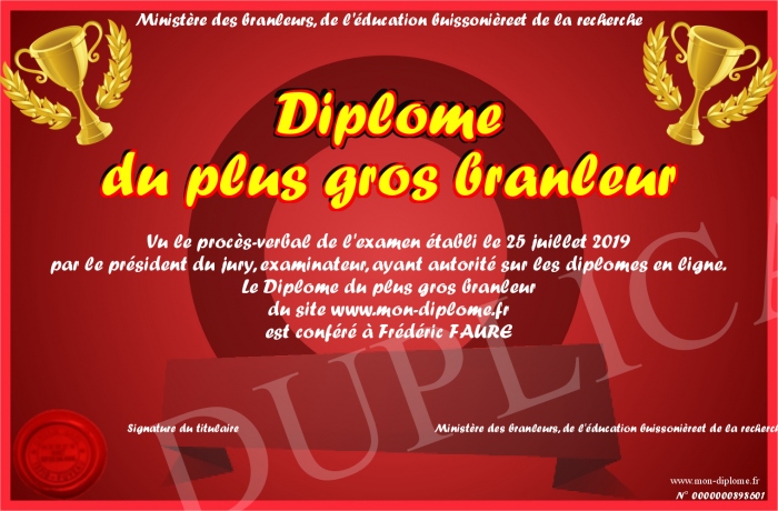 Envoyez par email votre Diplôme du plus gros branleur personalisé