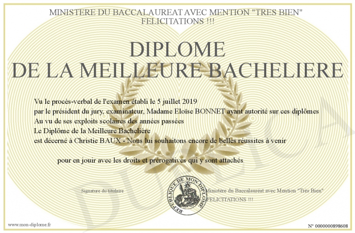 Envoyez par email votre Diplôme de la meilleure Bachelière personalisé
