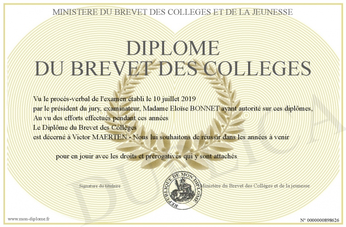 Envoyez par email votre Diplôme du Brevet des Collèges personalisé