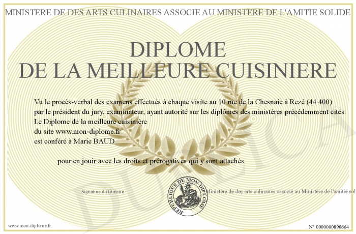 Envoyez par email votre Diplôme de la meilleure cuisinière personalisé