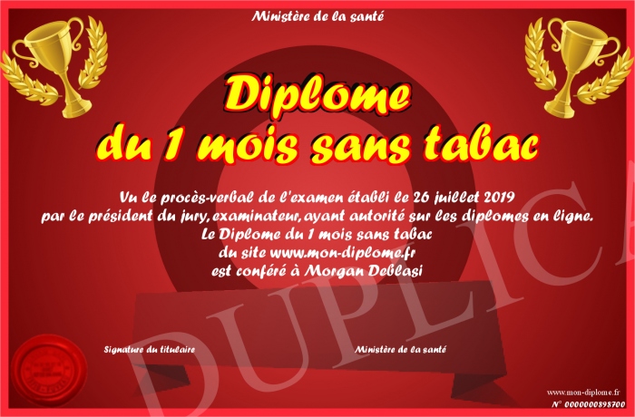 Envoyez par email votre Diplôme du 1 mois sans tabac personalisé