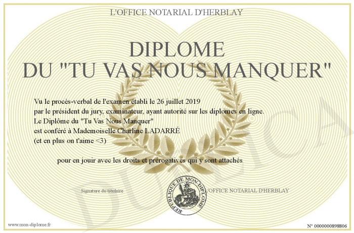 Envoyez par email votre Diplôme du -Tu Vas Nous Manquer- personalisé